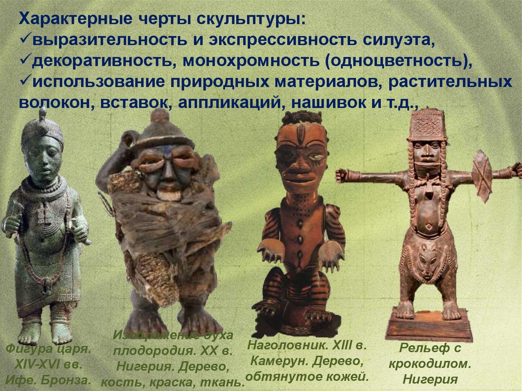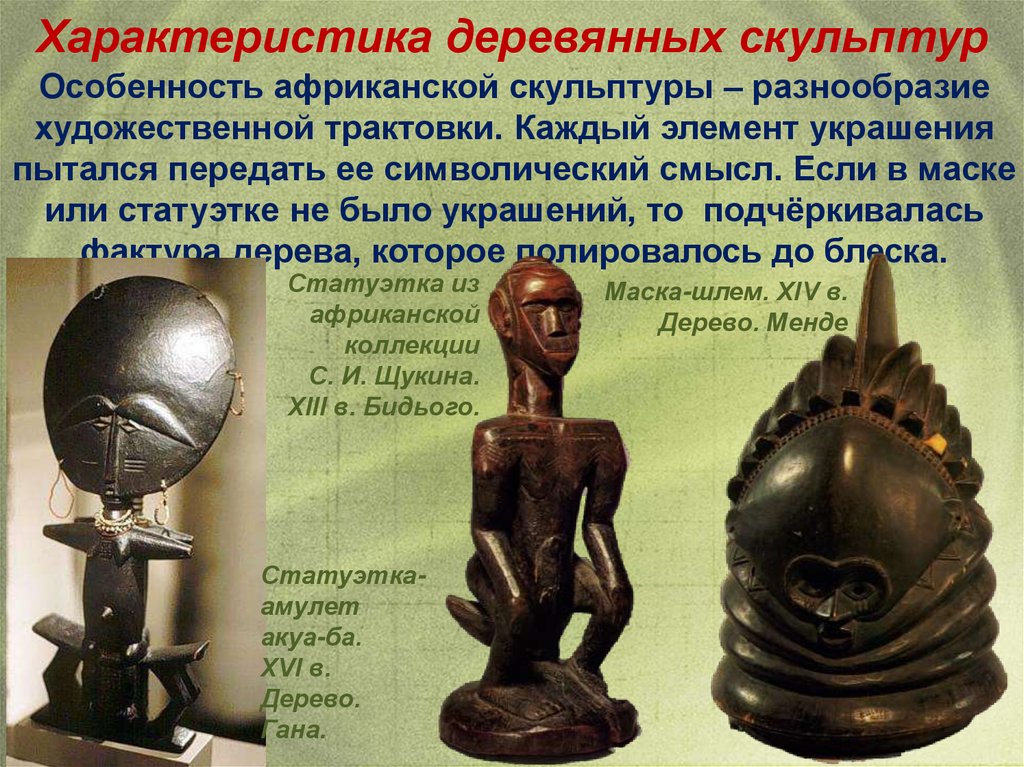 Характеристика деревянных скульптурОсобенность африканской скульптуры – разнообразие