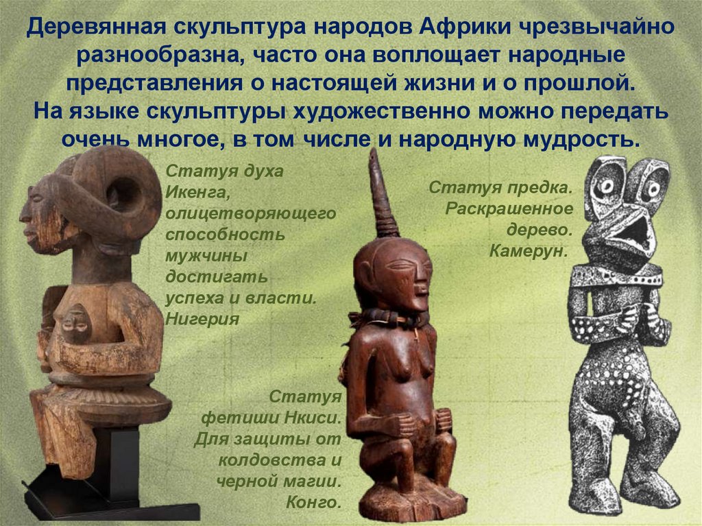 Деревянная скульптура народов Африки чрезвычайноразнообразна, часто она воплощает народные