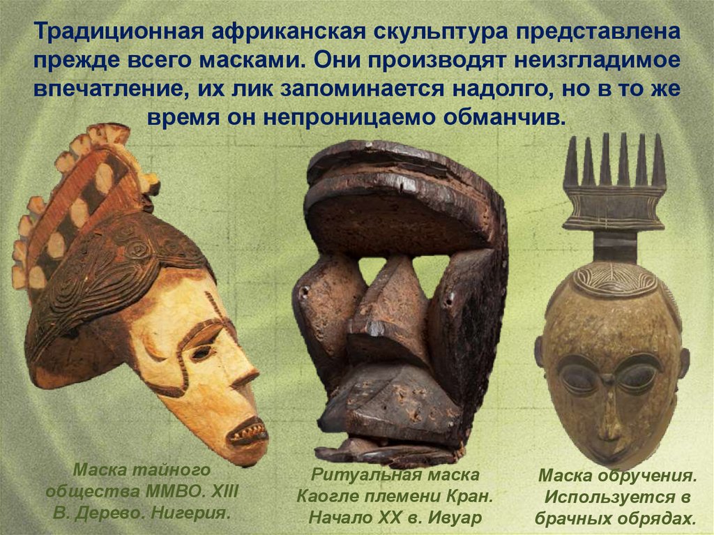 Традиционная африканская скульптура представленапрежде всего масками. Они производят неизгладимое