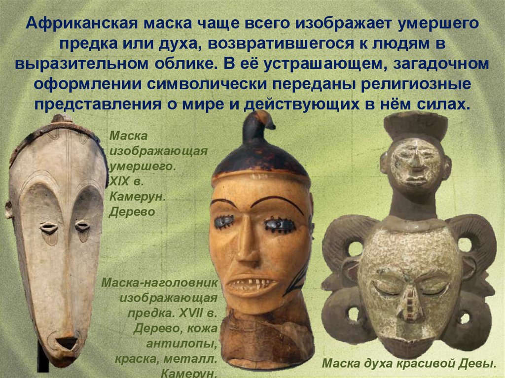 Африканская маска чаще всего изображает умершегопредка или духа, возвратившегося к людям в