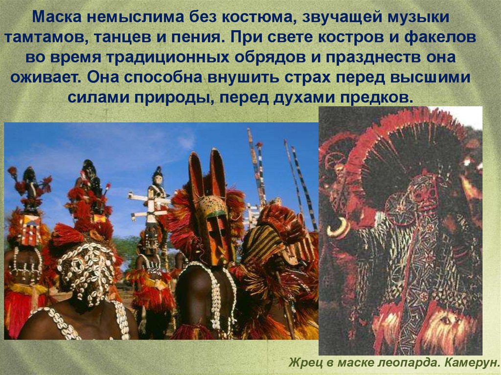 Маска немыслима без костюма, звучащей музыкитамтамов, танцев и пения. При свете костров и факелов