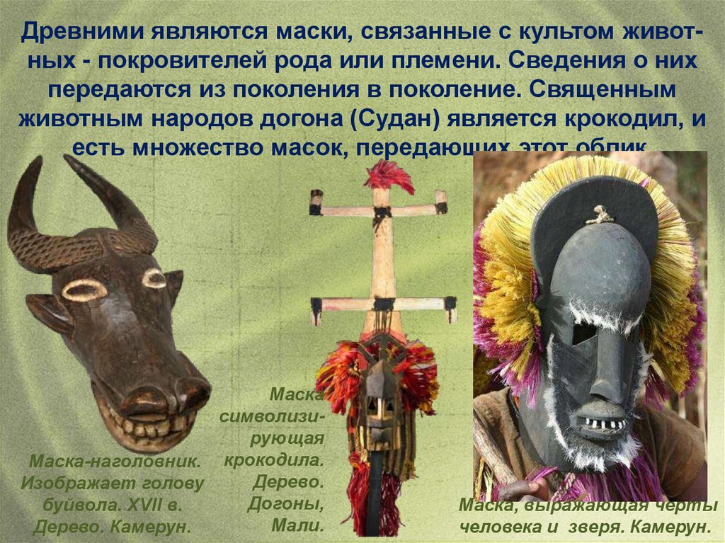 Древними являются маски, связанные с культом животных - покровителей рода или племени. Сведения о нихпередаются из поколения в поколение. Священным