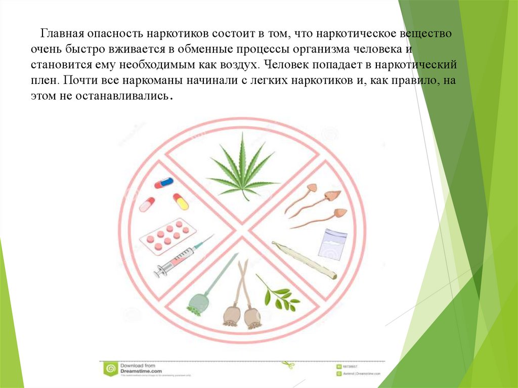 Главная опасность наркотиков состоит в том, что наркотическое веществоочень быстро вживается в обменные процессы организма человека и