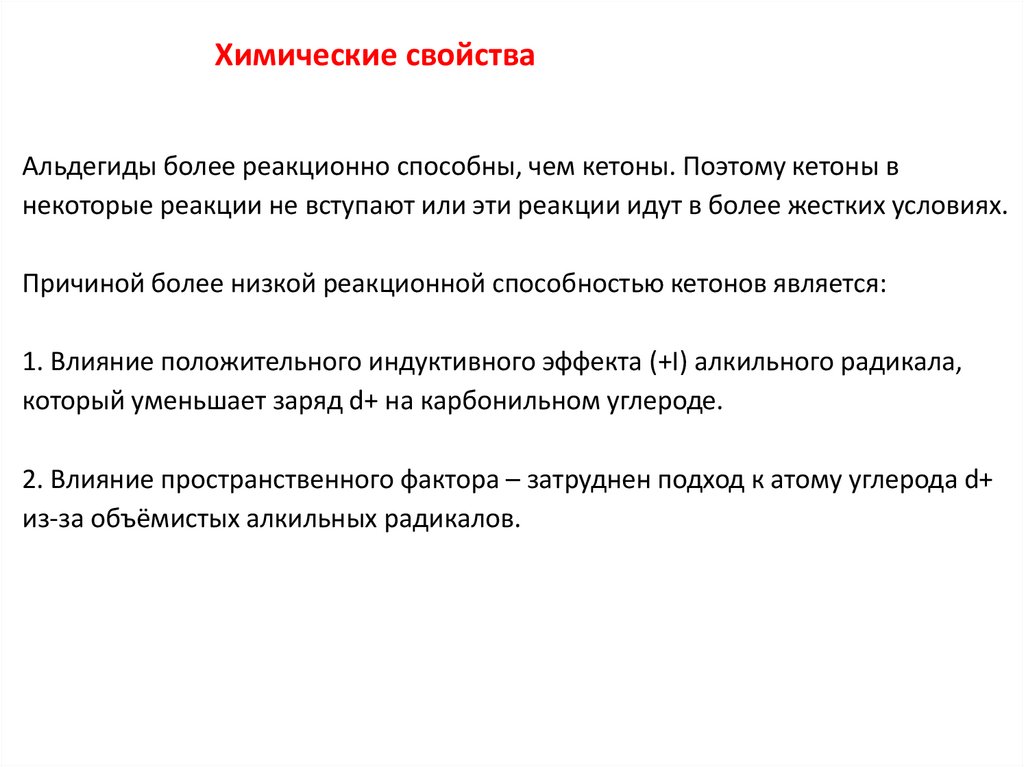 Химические свойстваАльдегиды более реакционно способны, чем кетоны. Поэтому кетоны в