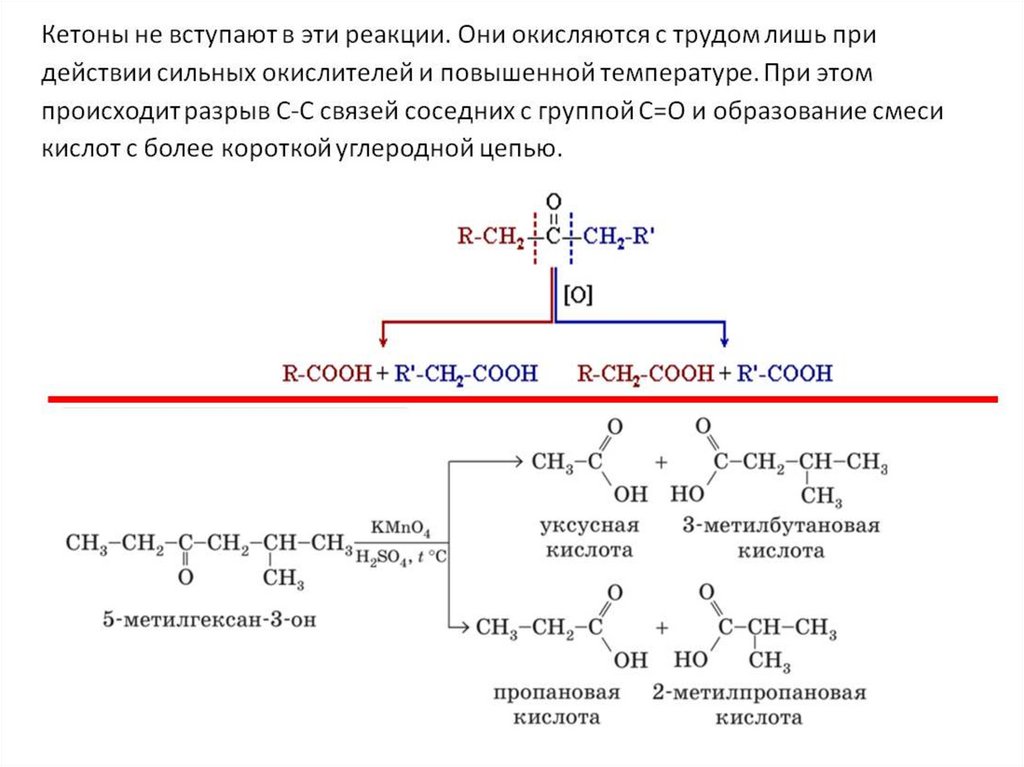кетоны окисляются с разрывом углеродной цепи;