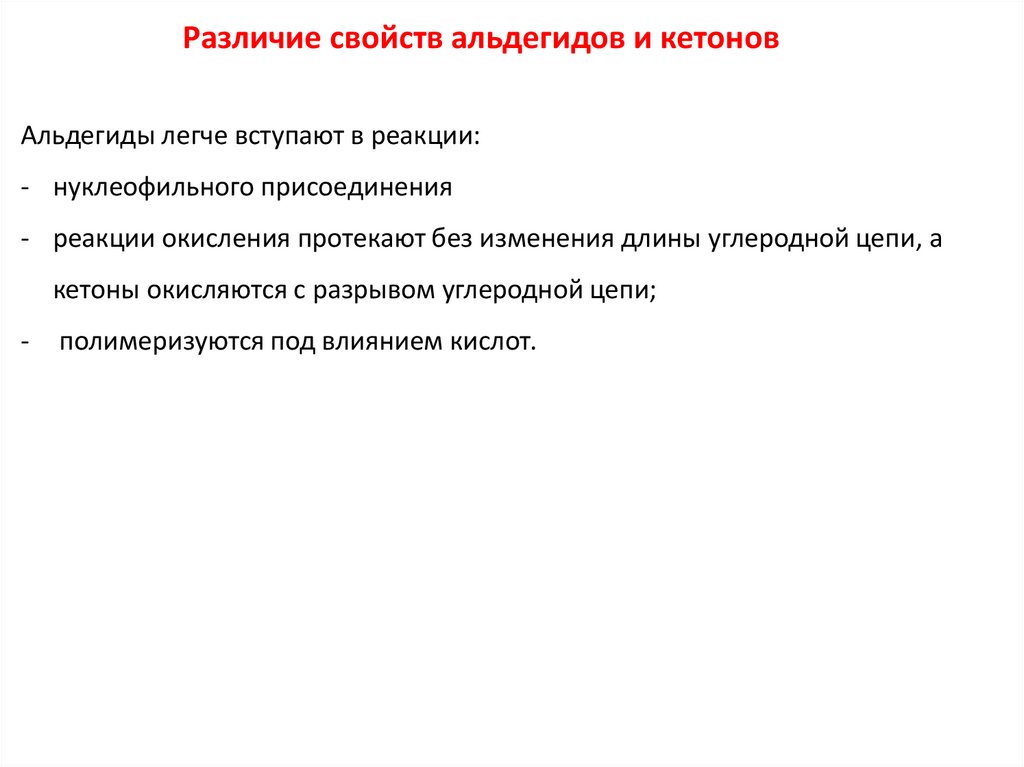 Различие свойств альдегидов и кетоновАльдегиды легче вступают в реакции: