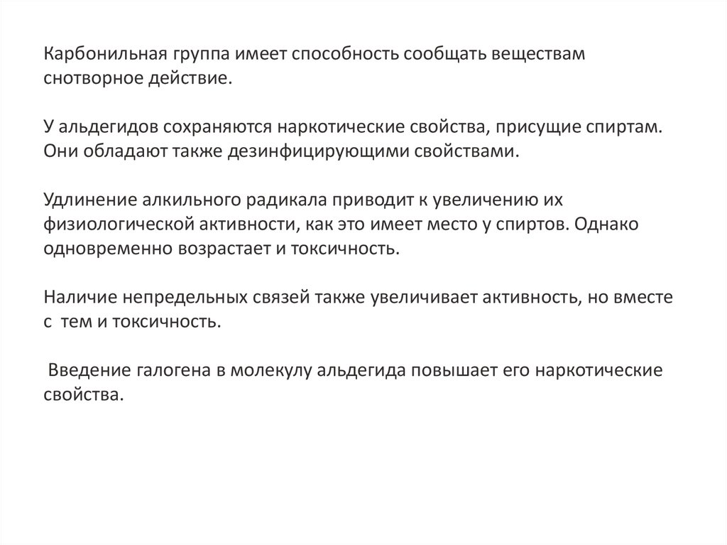 Карбонильная группа имеет способность сообщать веществамснотворное действие.