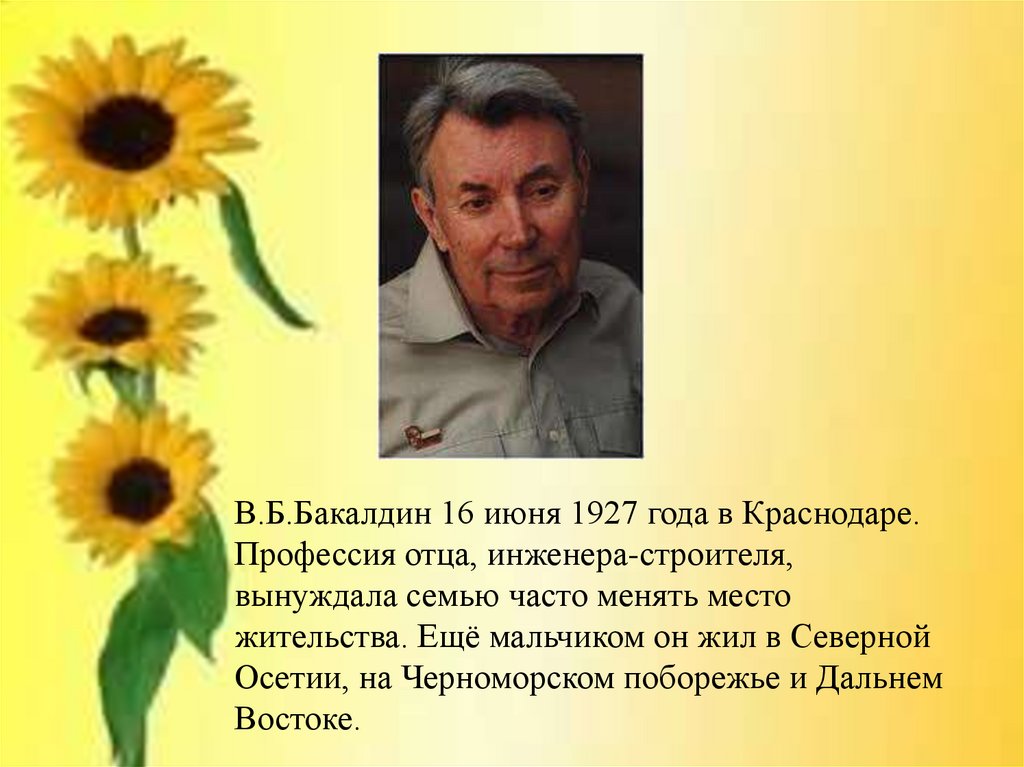 В.Б.Бакалдин 16 июня 1927 года в Краснодаре.Профессия отца, инженера-строителя,