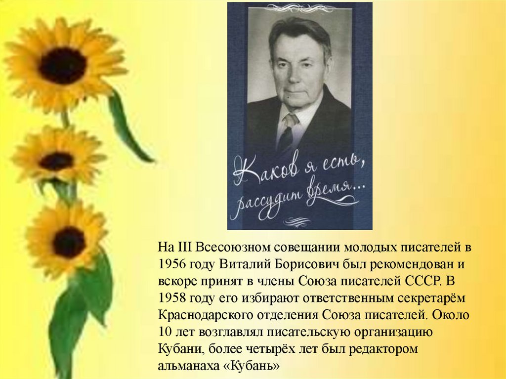 На III Всесоюзном совещании молодых писателей в1956 году Виталий Борисович был рекомендован и