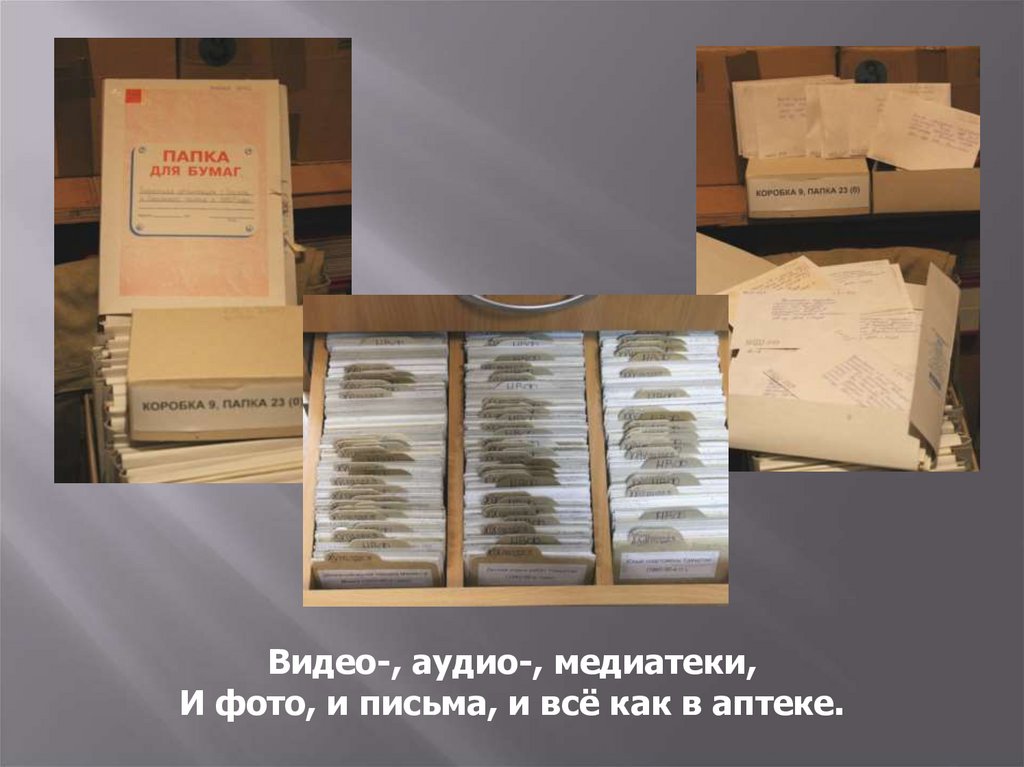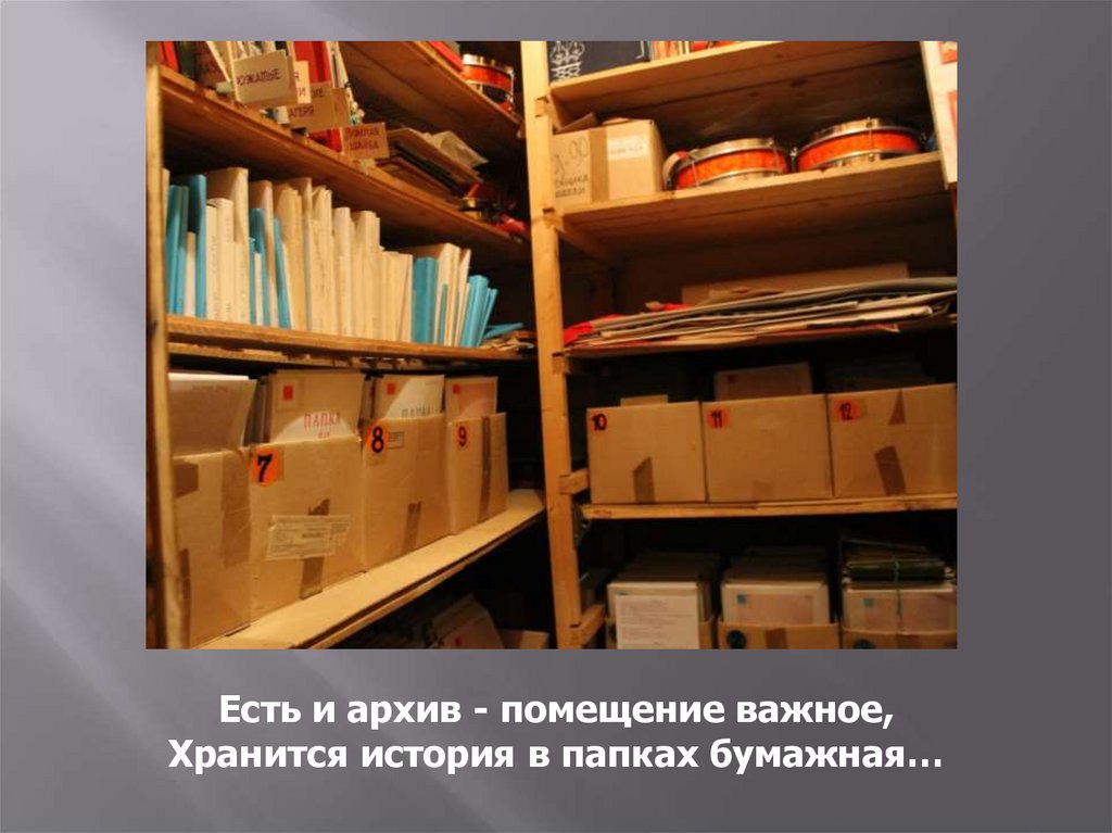 Есть и архив - помещение важное,Хранится история в папках бумажная…