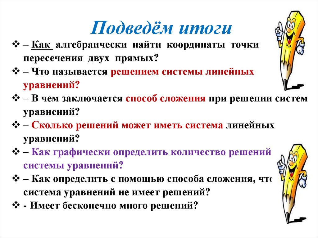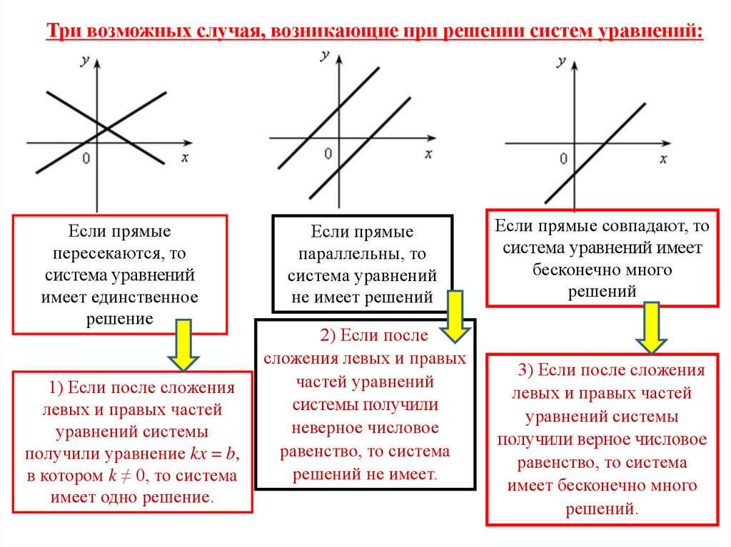 Три возможных случая, возникающие при решении систем уравнений:Если прямые