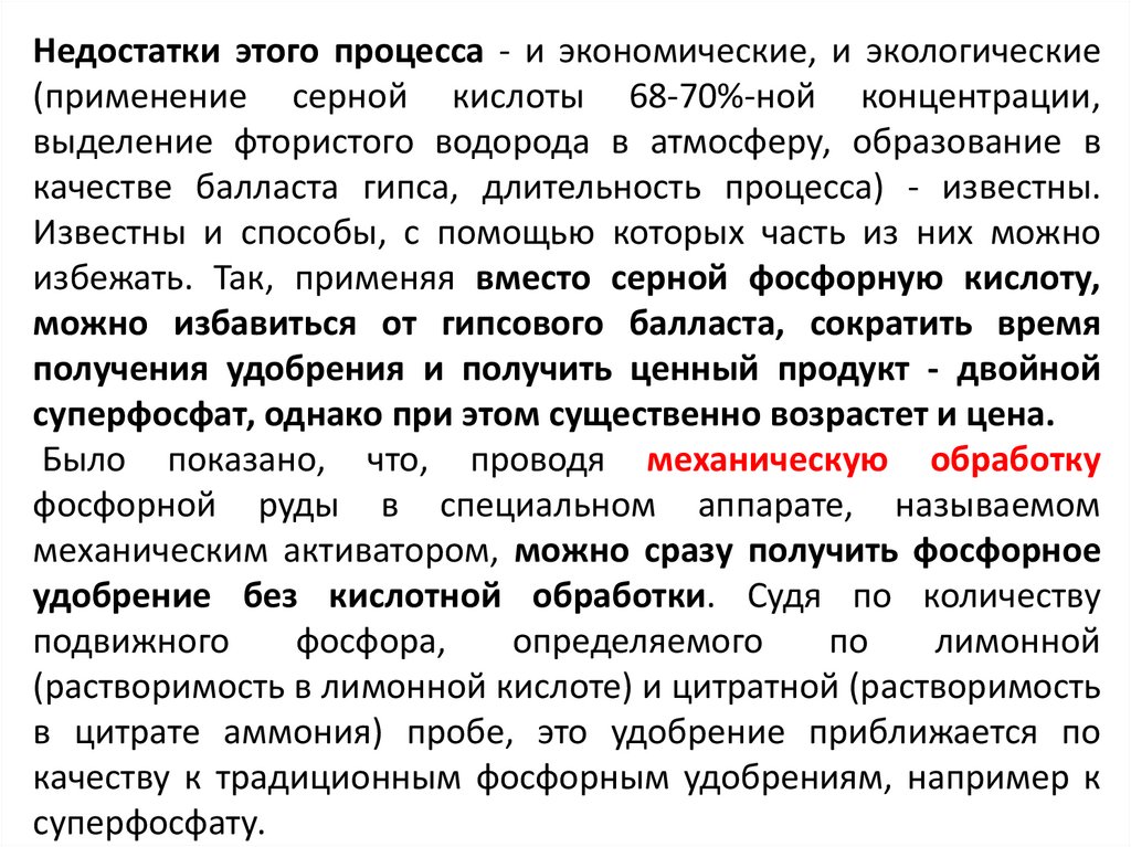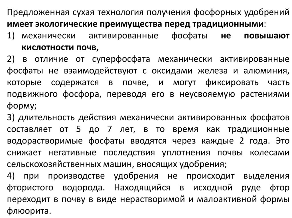 Предложенная сухая технология получения фосфорных удобренийимеет экологические преимущества перед традиционными: