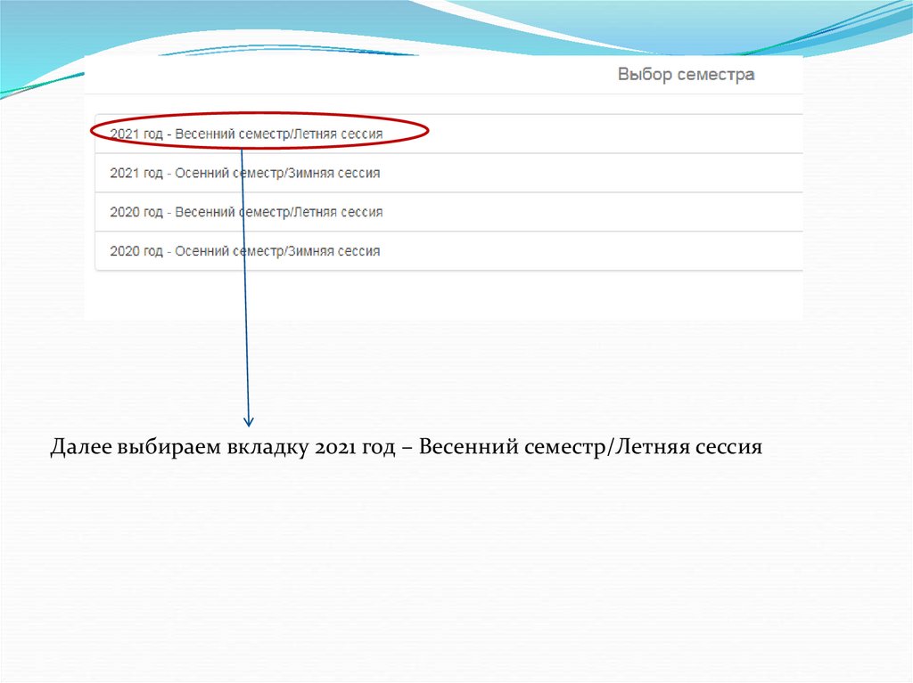 Далее выбираем вкладку 2021 год – Весенний семестр/Летняя сессия5.