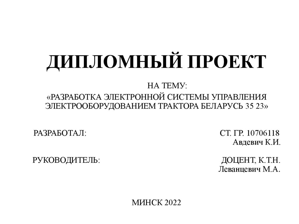 1. ДИПЛОМНЫЙ ПРОЕКТ НА ТЕМУ: «РАЗРАБОТКА ЭЛЕКТРОННОЙ СИСТЕМЫ УПРАВЛЕНИЯ ЭЛЕКТРООБОРУДОВАНИЕМ ТРАКТОРА БЕЛАРУСЬ 35 23» Разработал: