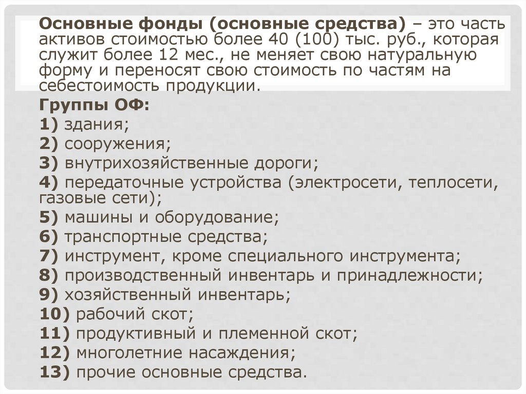 Основные фонды (основные средства) – это частьактивов стоимостью более 40 (100) тыс. руб., которая
