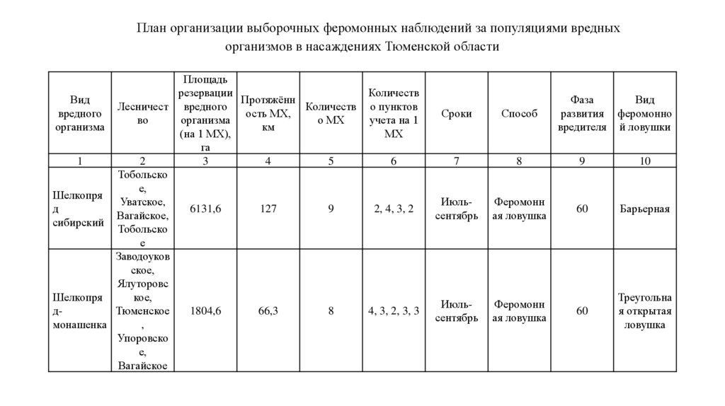 План организации выборочных феромонных наблюдений за популяциями вредныхорганизмов в насаждениях Тюменской области