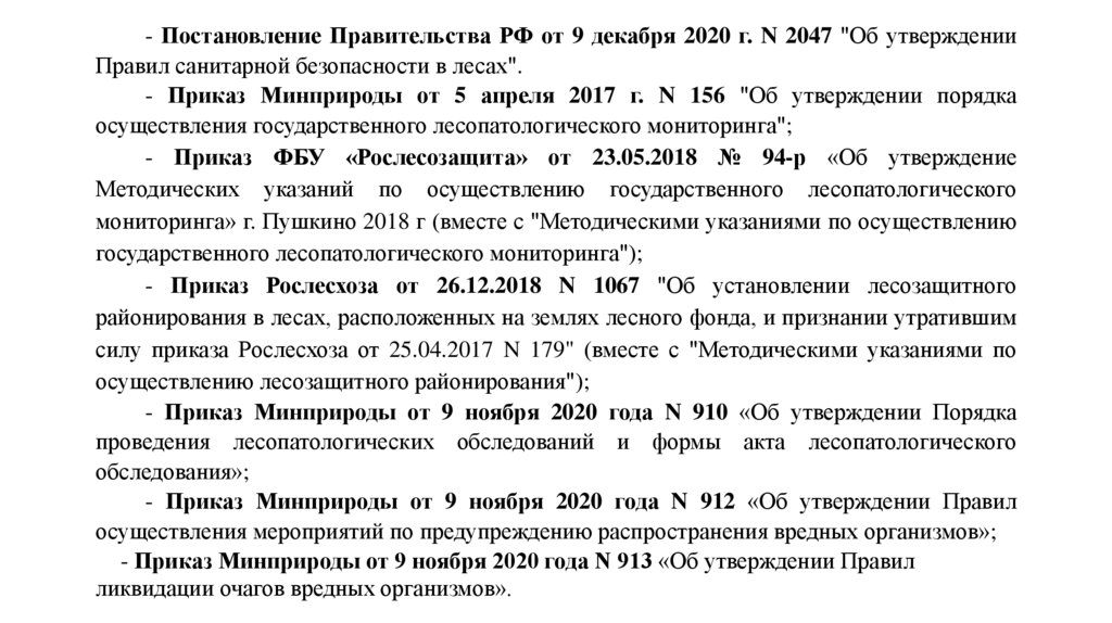 - Постановление Правительства РФ от 9 декабря 2020 г. N 2047 "Об утвержденииПравил санитарной безопасности в лесах".