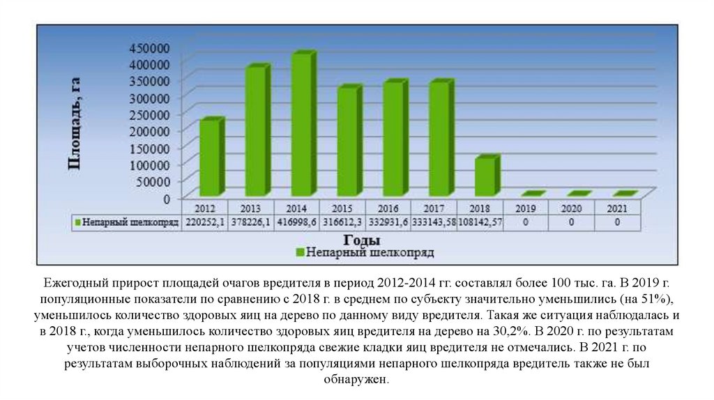 Ежегодный прирост площадей очагов вредителя в период 2012-2014 гг. составлял более 100 тыс. га. В 2019 г.популяционные показатели по сравнению с 2018 г. в среднем по субъекту значительно уменьшились (на 51%),