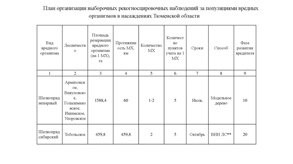 План организации выборочных рекогносцировочных наблюдений за популяциями вредныхорганизмов в насаждениях Тюменской области