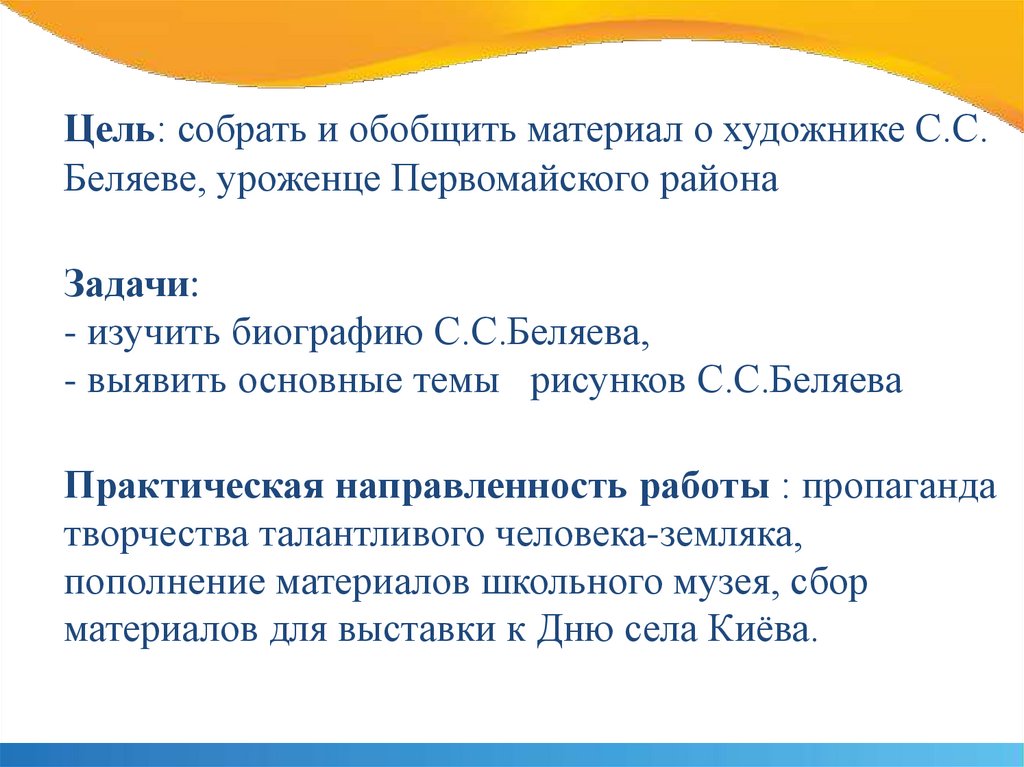 Цель: собрать и обобщить материал о художнике С.С.Беляеве, уроженце Первомайского района
