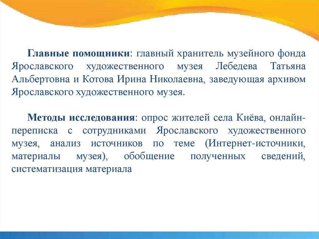 Методы исследования: опрос жителей села Киёва, онлайнпереписка с сотрудниками Ярославского художественного