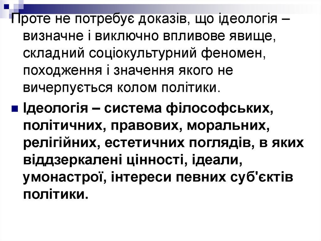 Проте не потребує доказів, що ідеологія –визначне і виключно впливове явище,