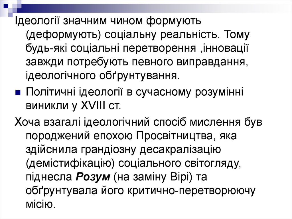 Ідеології значним чином формують(деформують) соціальну реальність. Тому