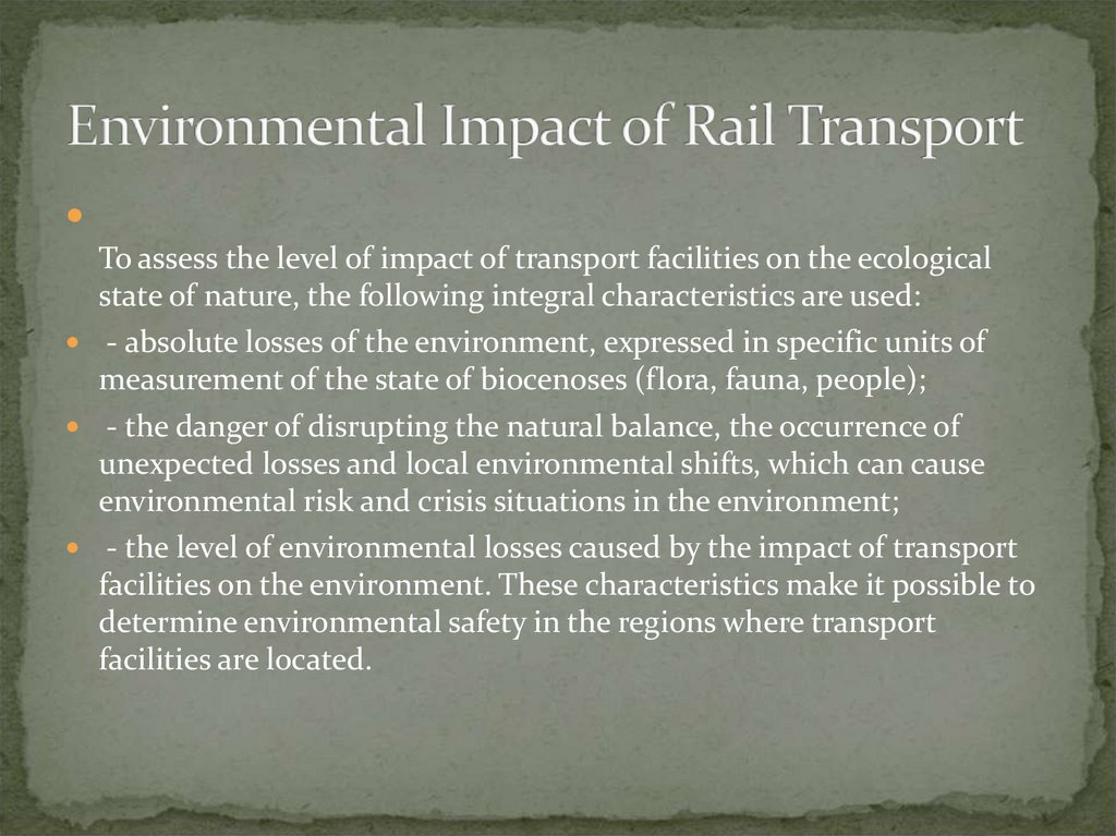 To assess the level of impact of transport facilities on the ecologicalstate of nature, the following integral characteristics are used:
