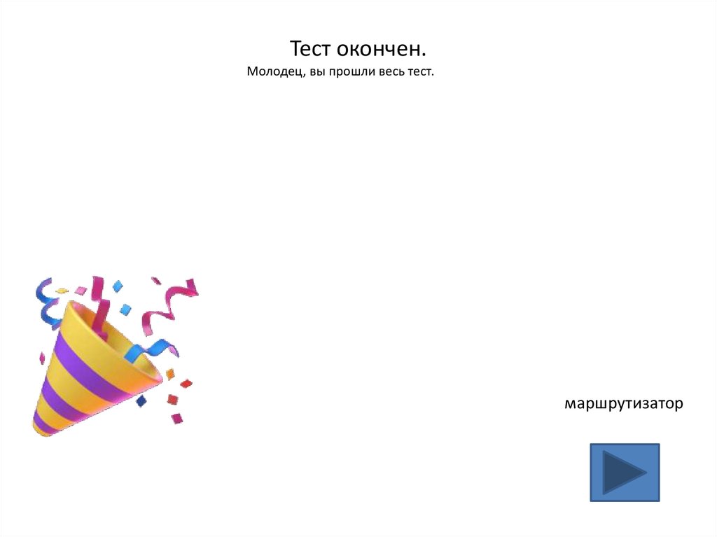 Тест окончен.Молодец, вы прошли весь тест.