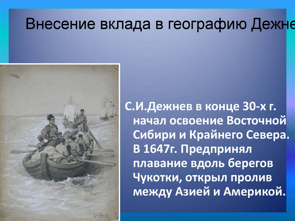 Внесение вклада в географию ДежнеС.И.Дежнев в конце 30-х г.