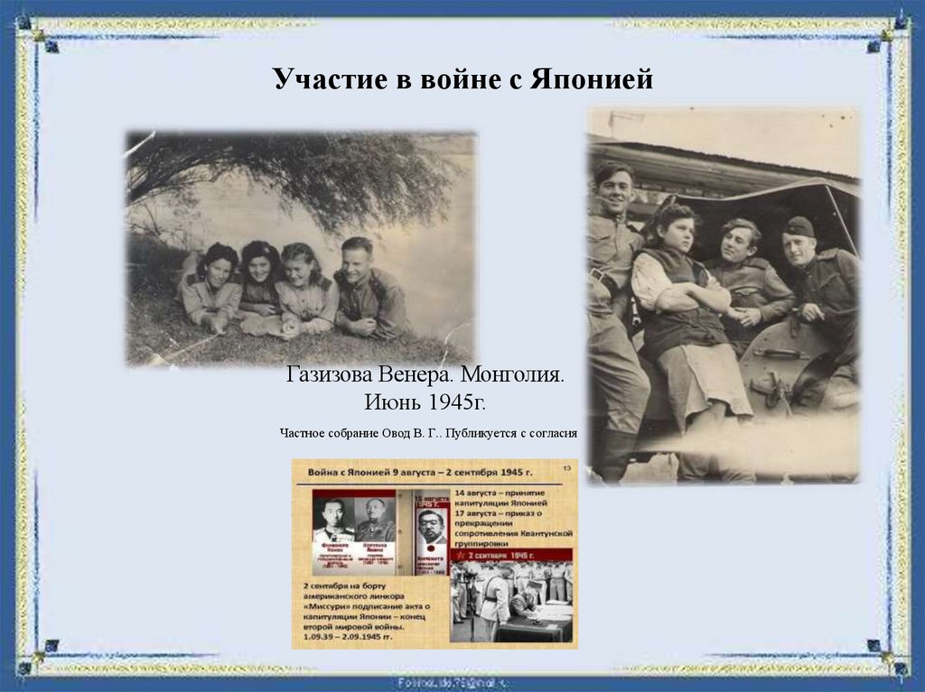 Участие в войне с ЯпониейГазизова Венера. Монголия.