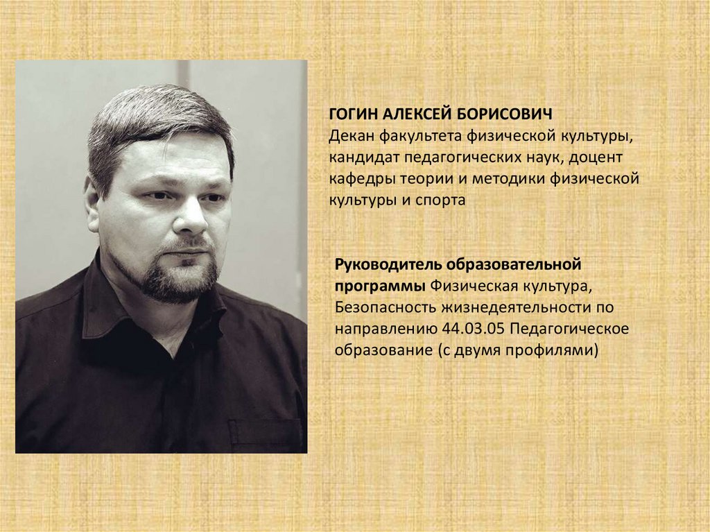 ГОГИН АЛЕКСЕЙ БОРИСОВИЧДекан факультета физической культуры,