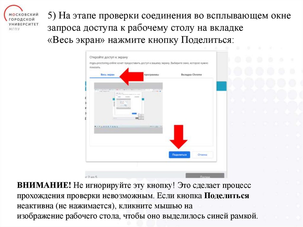 всплывающем окне "Открыть доступ к экрану" кнопку Поделиться;