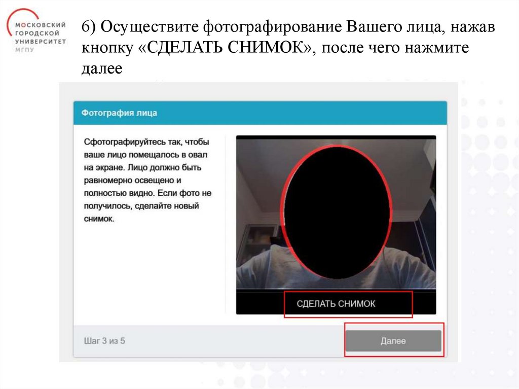 6) Осуществите фотографирование Вашего лица, нажавкнопку «СДЕЛАТЬ СНИМОК», после чего нажмите