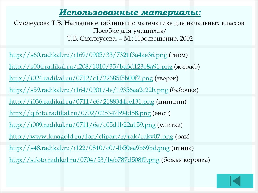 Использованные материалы:Смолеусова Т.В. Наглядные таблицы по математике для начальных классов: