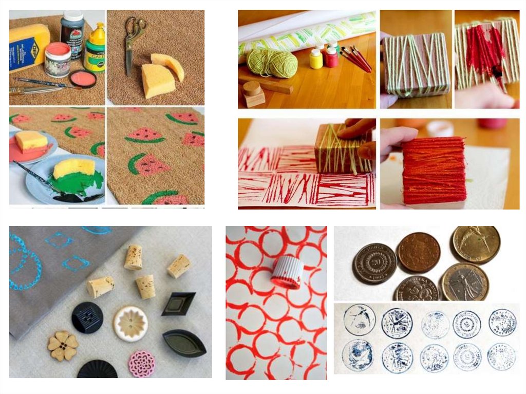 При работе можно использовать трафареты, штампы, любые подручные материалы.