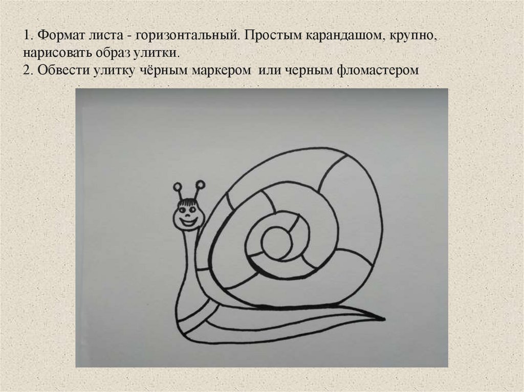 1. Формат листа - горизонтальный. Простым карандашом, крупно,нарисовать образ улитки.