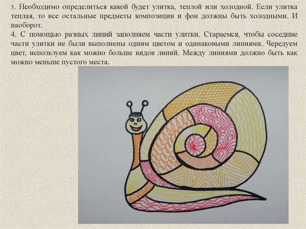 части улитки не были выполнены одним цветом и одинаковыми линиями. Чередуем