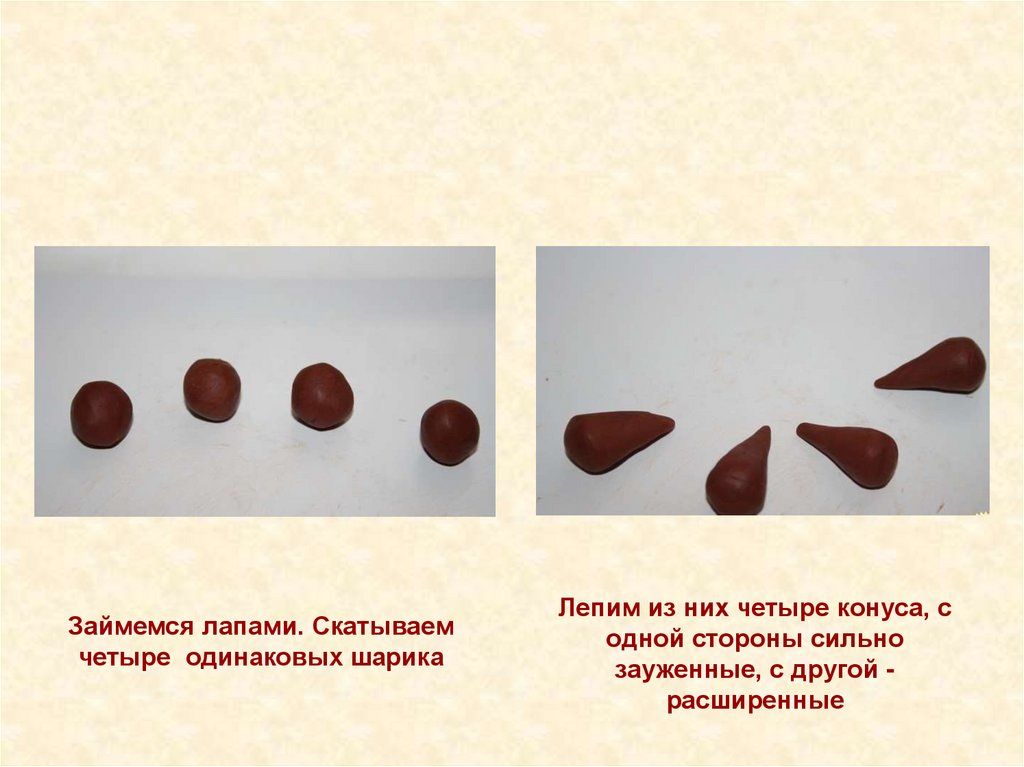 Займемся лапами. Скатываемчетыре одинаковых шарика
