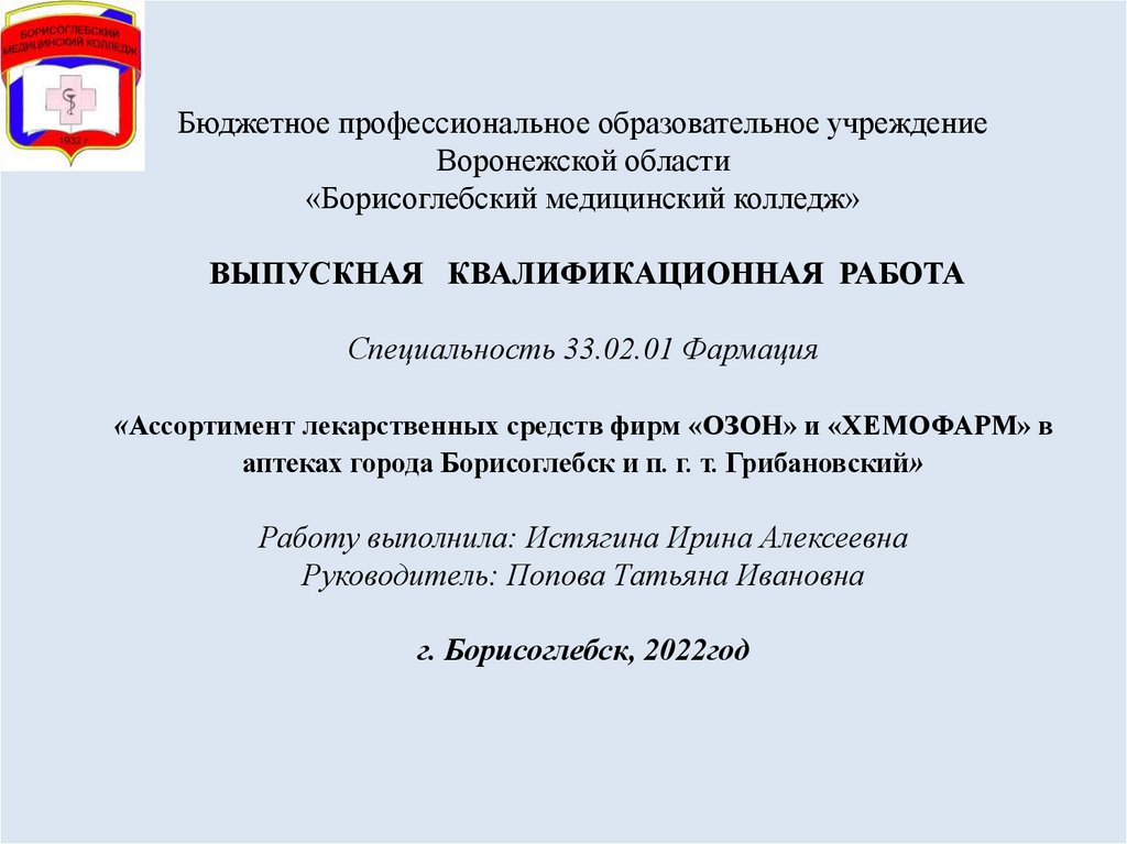 Ассортимент лекарственных средств фирм «ОЗОН» и «ХЕМОФАРМ» в аптеках города Борисоглебск и п. г. т. Грибановский