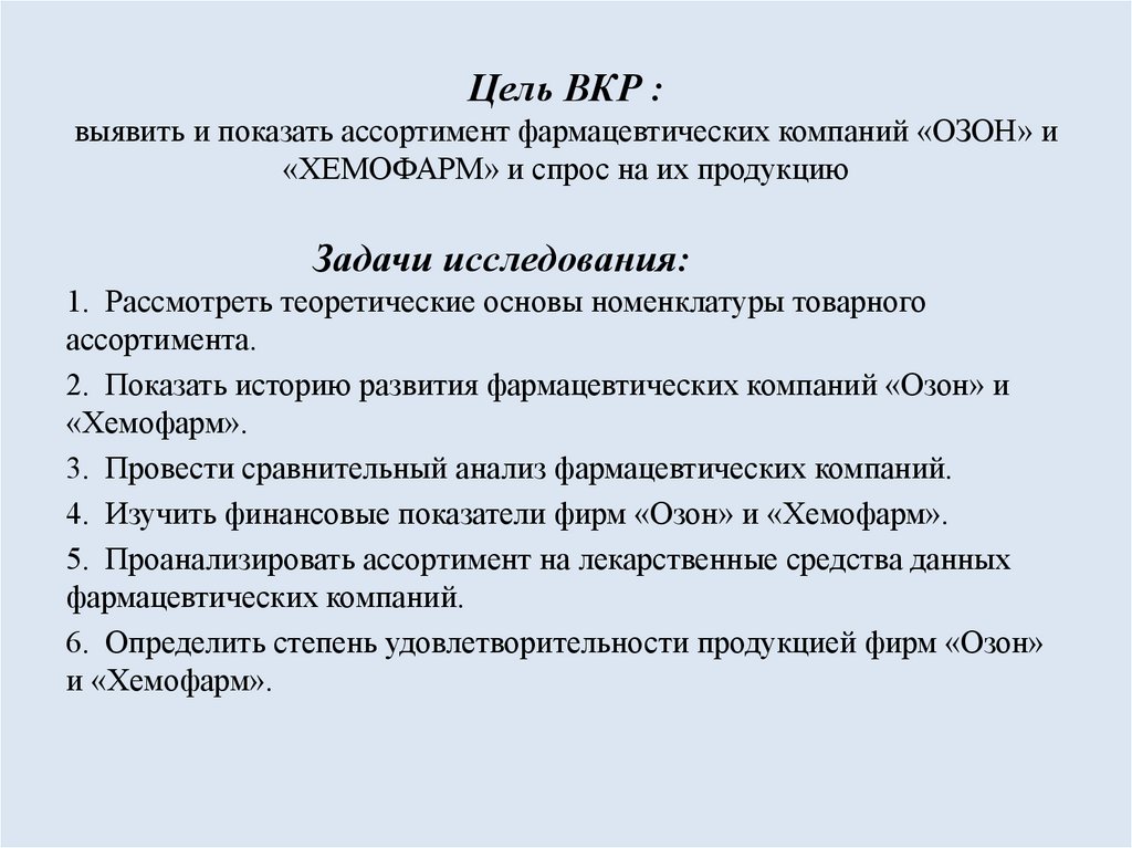 Цель ВКР :выявить и показать ассортимент фармацевтических компаний «ОЗОН» и