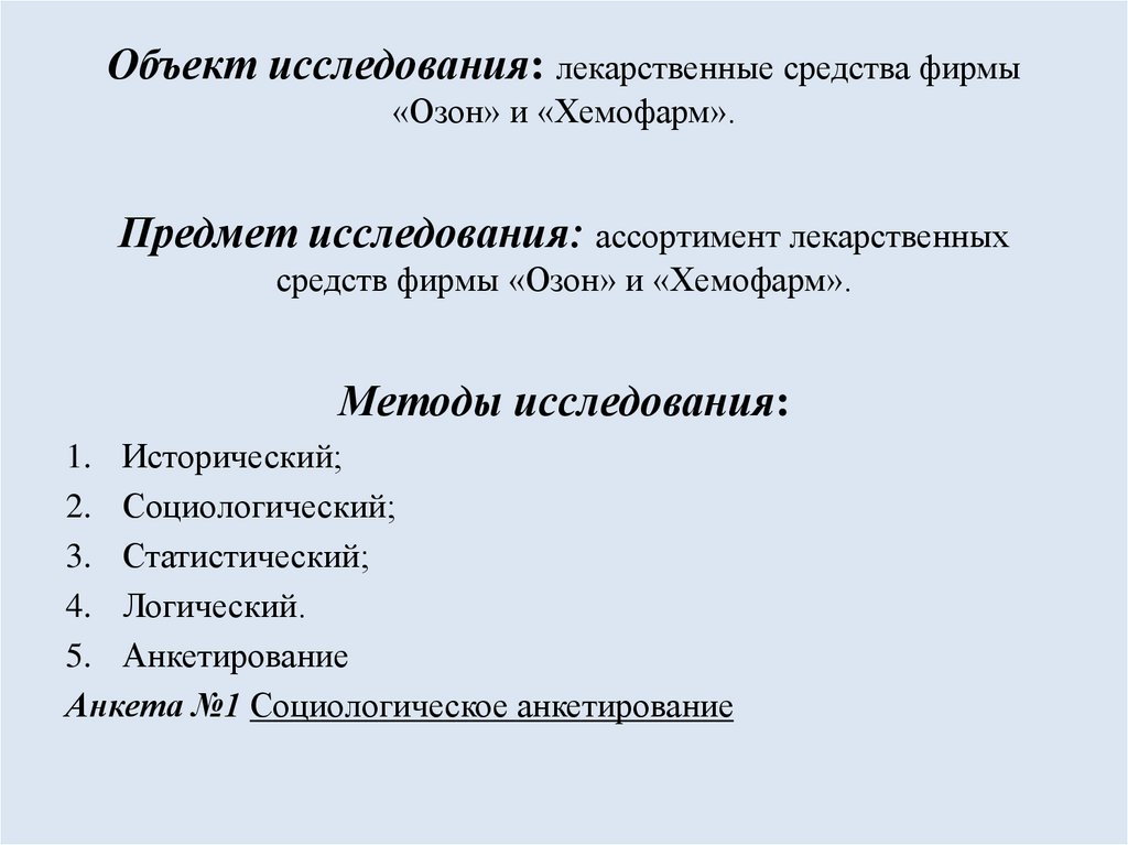 Объект исследования: лекарственные средства фирмы«Озон» и «Хемофарм».