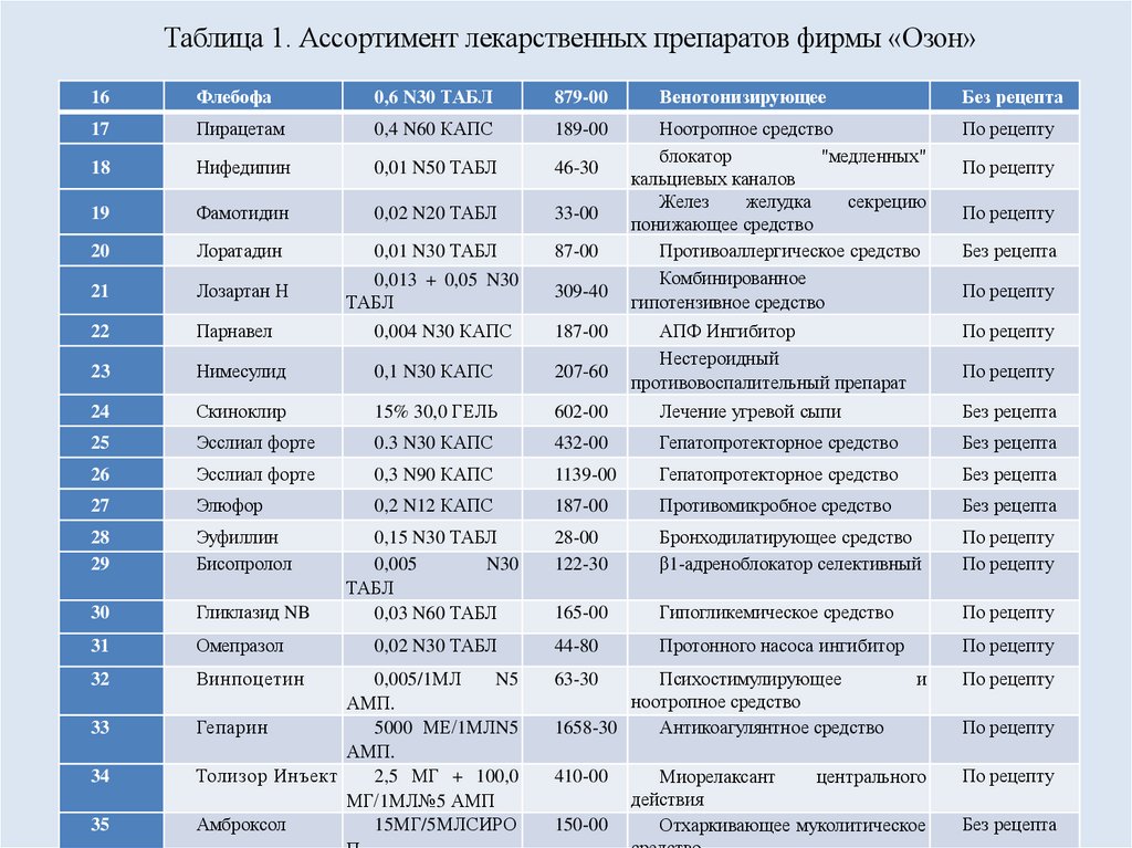 8. Таблица 1. Ассортимент лекарственных препаратов фирмы «Озон»