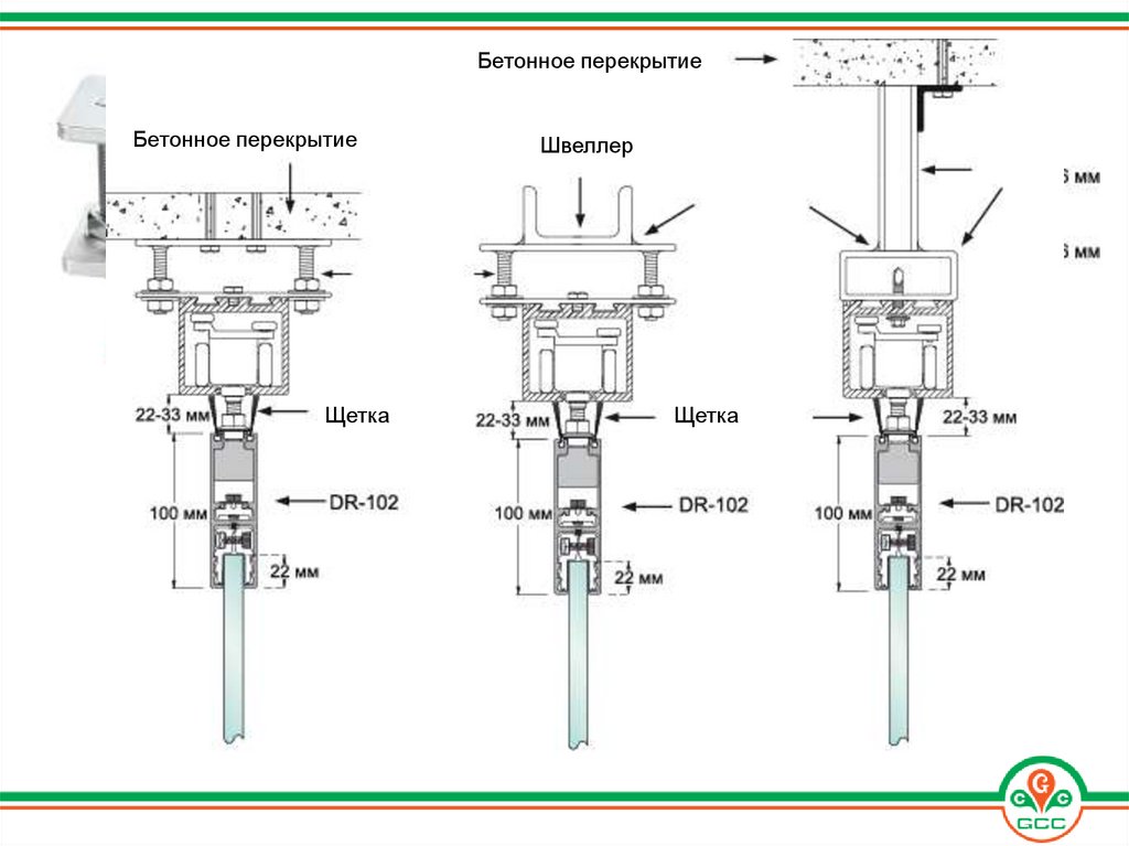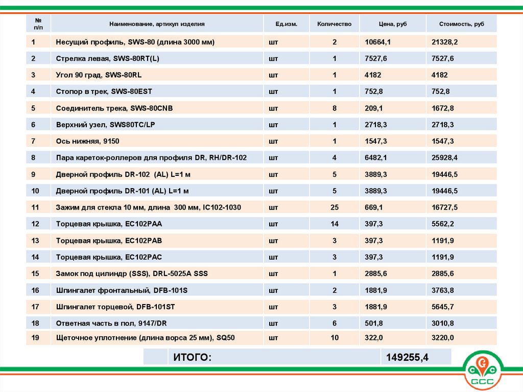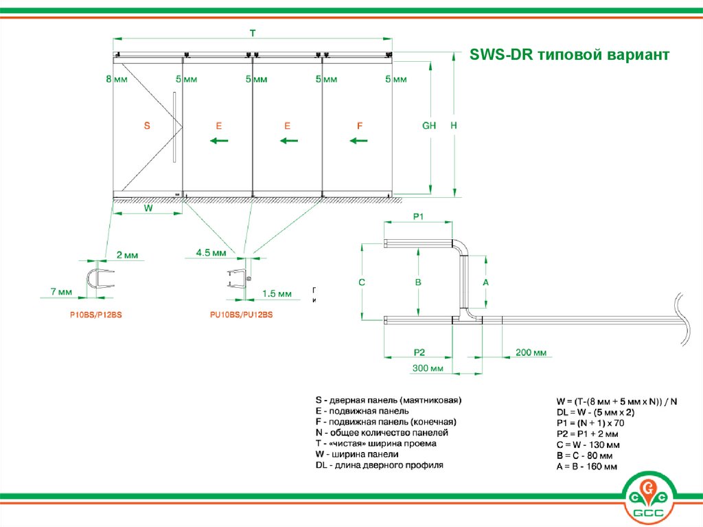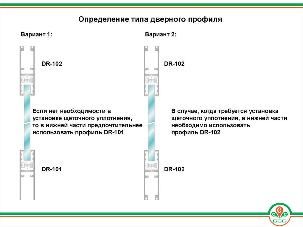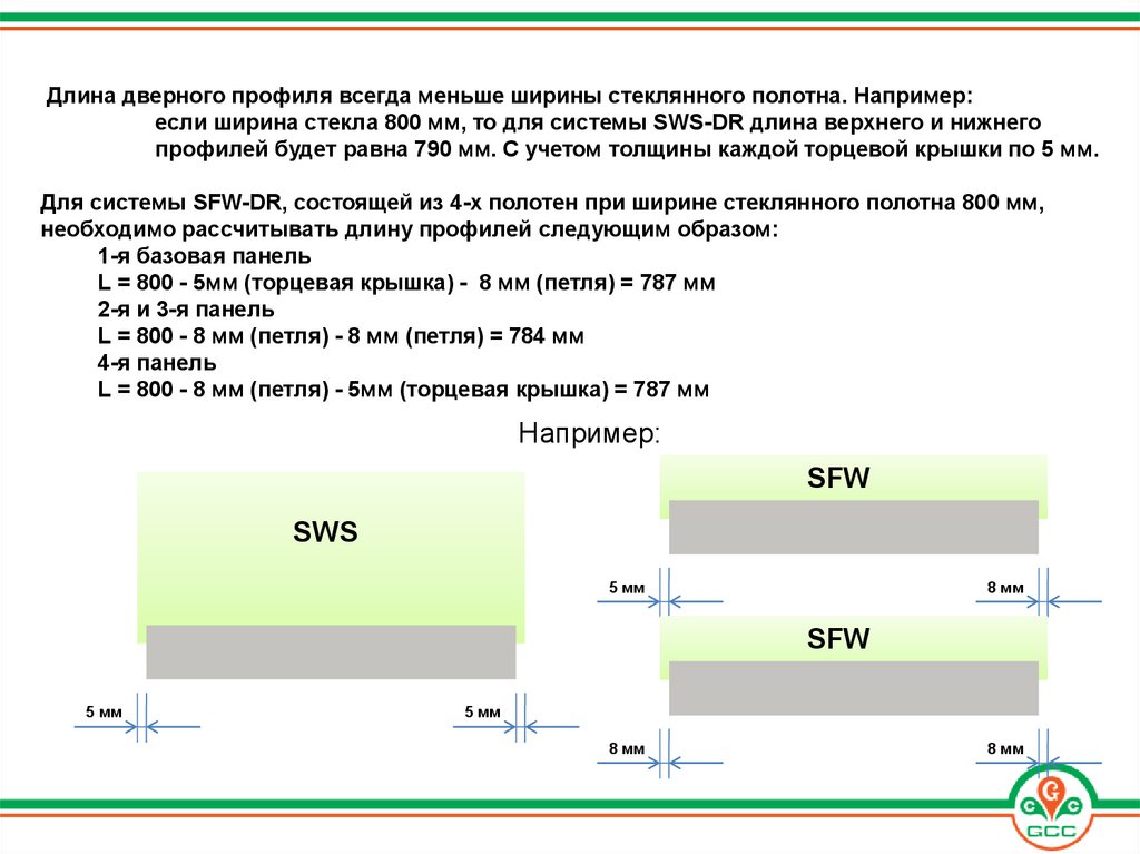 Длина дверного профиля всегда меньше ширины стеклянного полотна. Например:если ширина стекла 800 мм, то для системы SWS-DR длина верхнего и нижнего