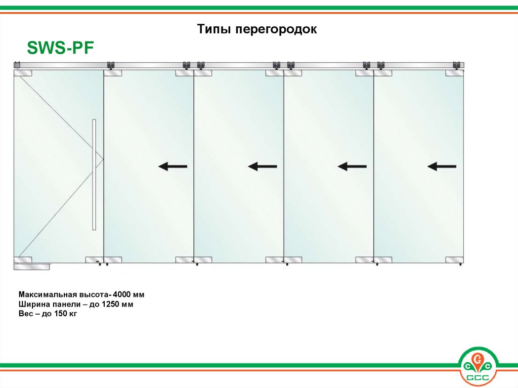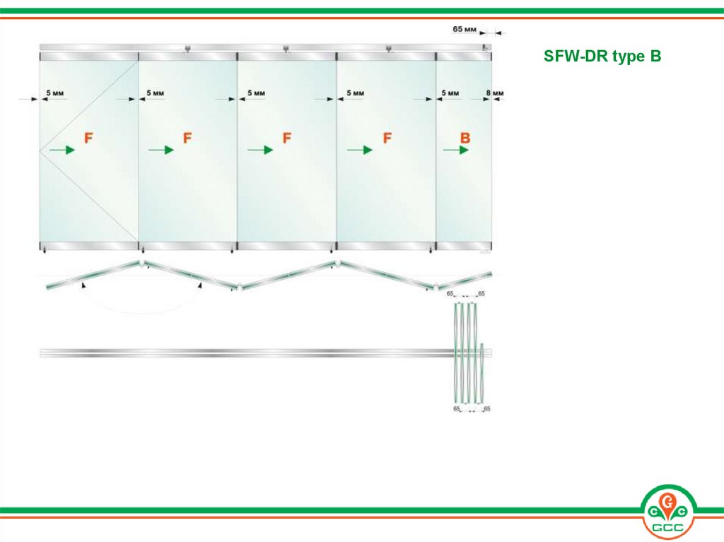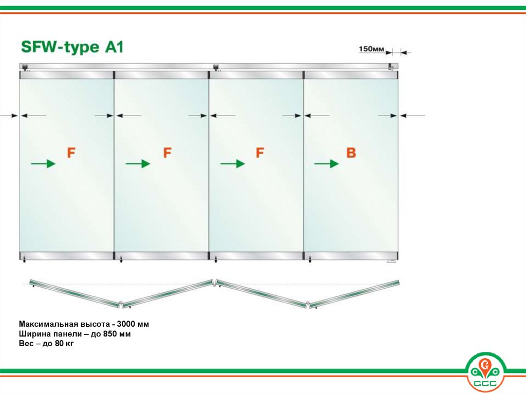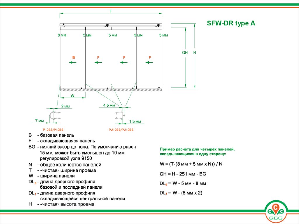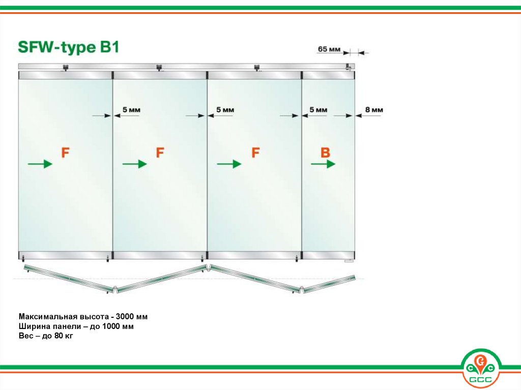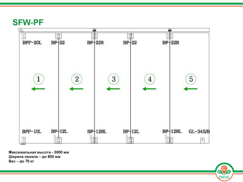 Для системы SFW-DR, состоящей из 4-х полотен при ширине стеклянного полотна 800 мм,
