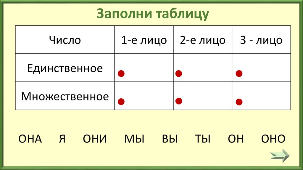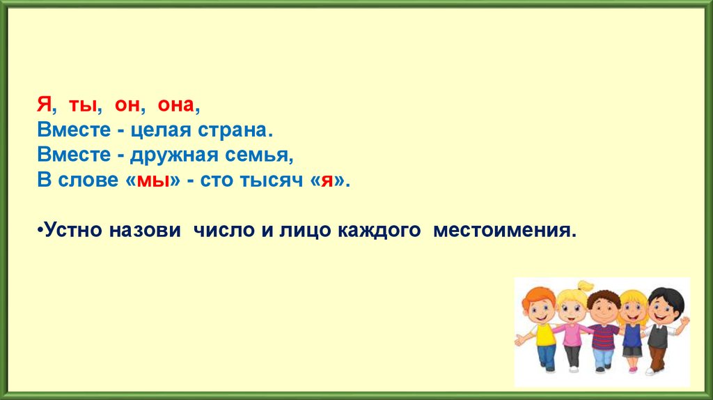 •Устно назови число и лицо каждого местоимения.