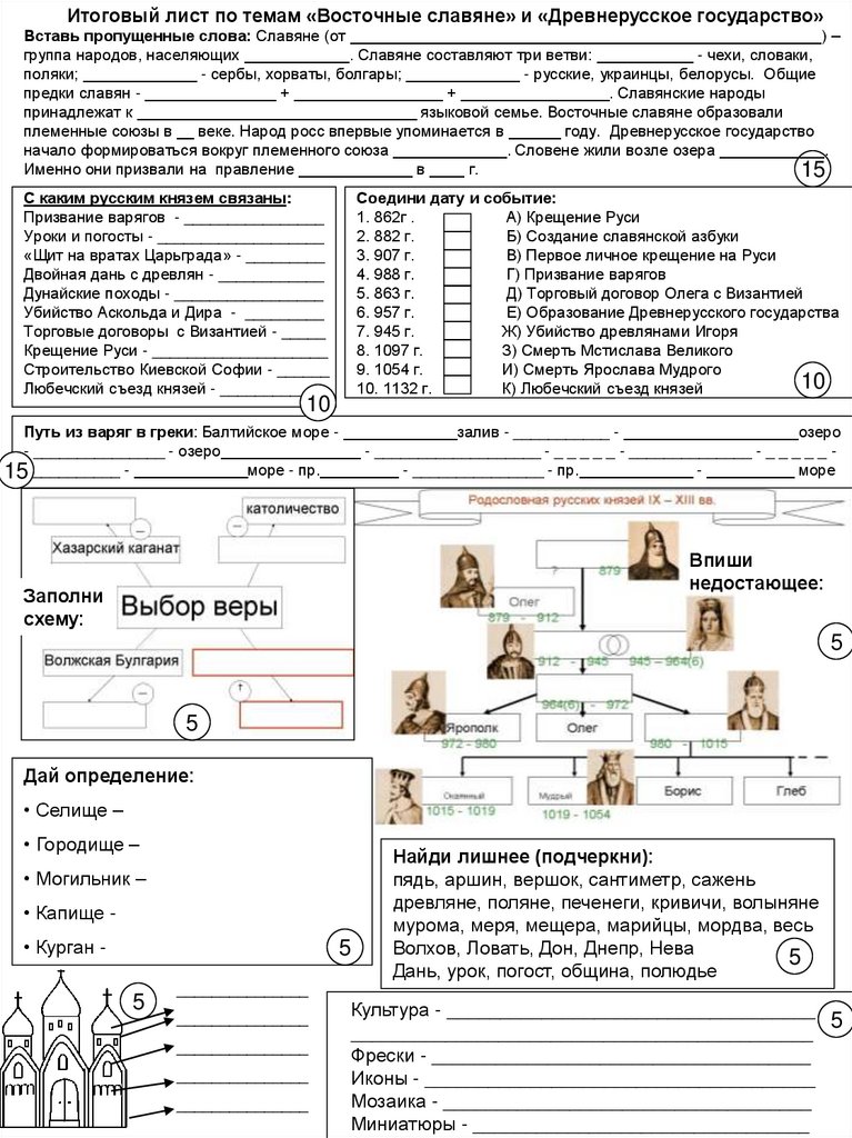 Итоговый лист по темам «Восточные славяне» и «Древнерусское государство»