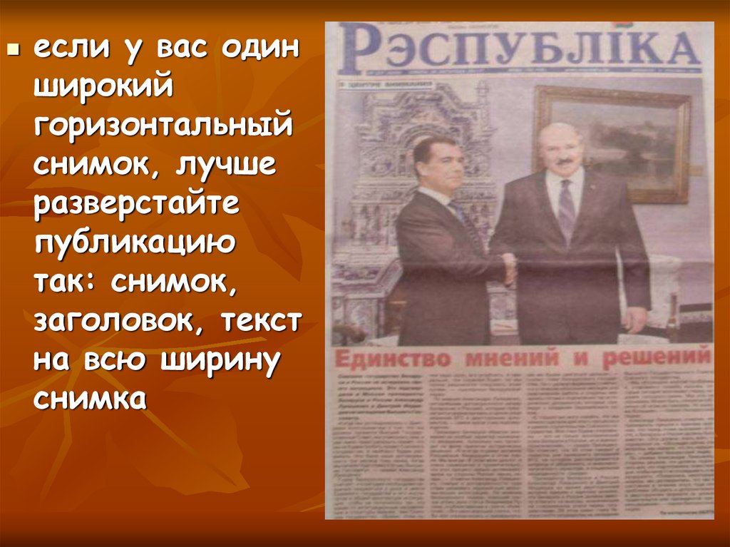 никогда не ставьте фото в концестатьи или в конце полосы;