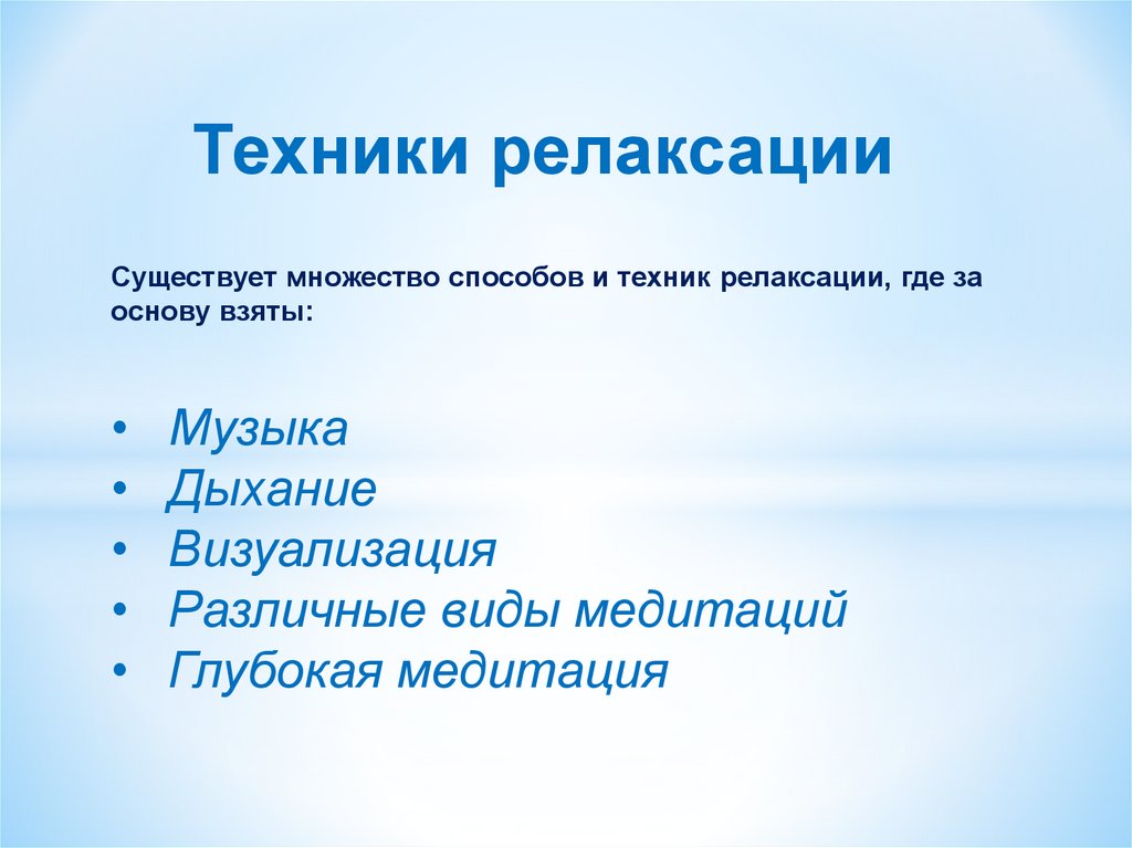 Техники релаксацииСуществует множество способов и техник релаксации, где за