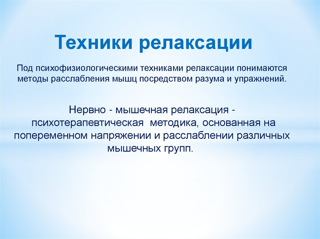 Техники релаксацииПод психофизиологическими техниками релаксации понимаются